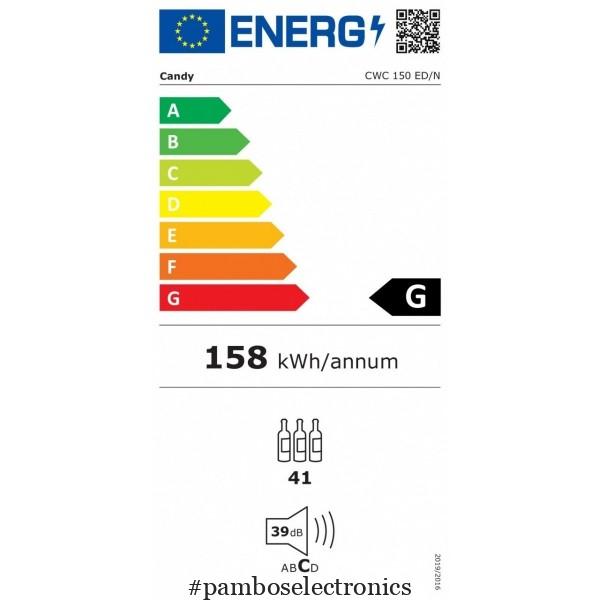 Candy DiVino CWC 150 ED/N. Appliance placement: Freestanding, Housing color: Black, Inner color: Black. Bottle capacity: 41 bottle(s), Product type: Compressor wine cooler, Temperature range (zone 1): 7 – 18°C. Energy efficiency class: G, Annual energy consumption: 158 kWh, Energy efficiency scale: A to G. Control type: Rotary, Lamp type: LED, Control apps supported: hOn. Width: 490 mm, Depth: 550 mm, Height: 845 mm