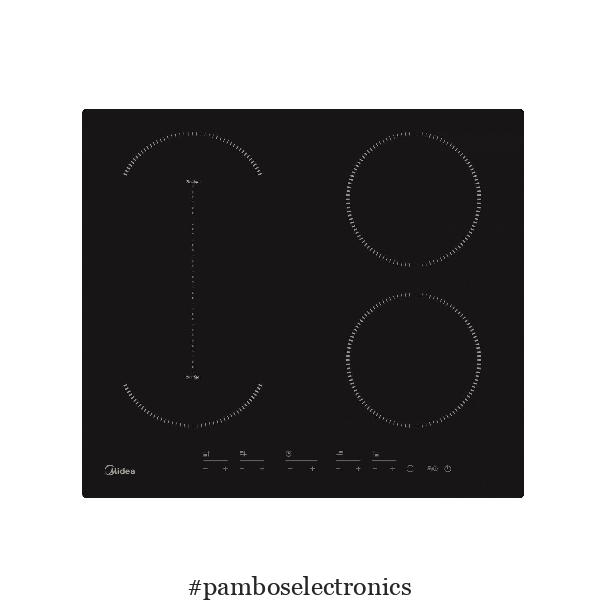 Midea MIH-616AC induction hob with frameless design, 60cm width. Features 4 cooking zones Booster function, Bridge function that can merge the 2 indepent zones on the left to one big Flex Zone, touch control with 9 power levels, residual heat indicator levels for each zone, Timer with shutdown function for all zones and SafetyLock for children.